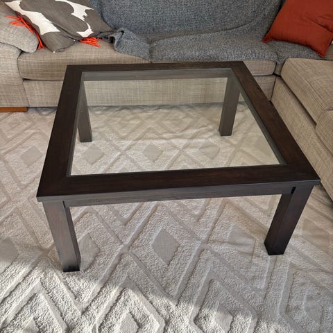 Ett riktigt bra soffbord med tre glasskivor de två lägre använder vi som avlastningsyta och/eller för prydnadsplacering.