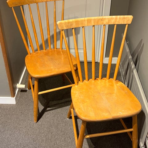 Två pinnstolar, snygg design men behöver lite ommålning eller slip lack eller behålla dem som de är lite bohostil.