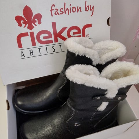 Bruna varmfodrade vinterkängor i skinn från Rieker, storlek 38. Mörkgrå mudd på skaftet. Stängs med dragkedja. Sula i gummi. Använda någon enstaka gång, som nya.