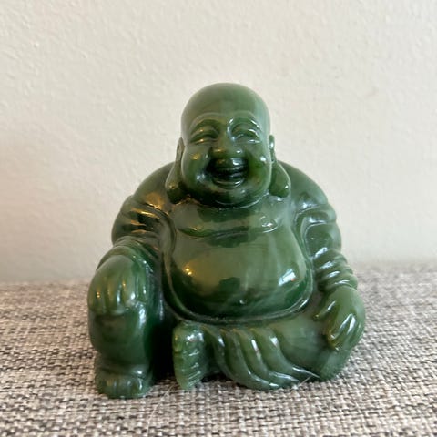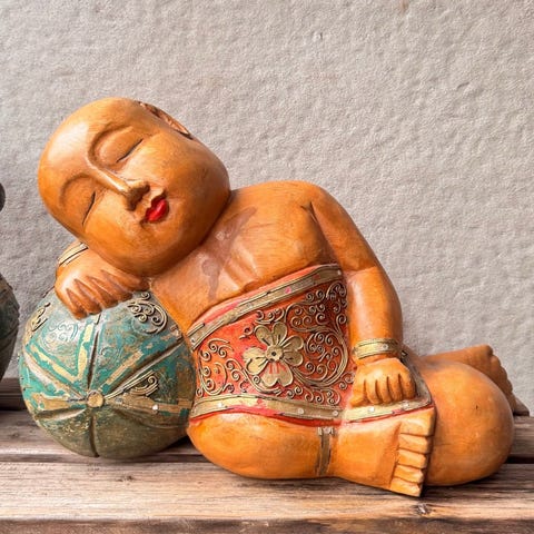 Metallskulptur föreställande en sittande figur med detaljerade utsmyckningar. Skulpturen har en blandning av mörka och guldfärgade ytor och visar en person i traditionell klädsel med huvudbonad och armband. Passar som dekorativt objekt.