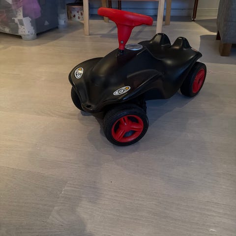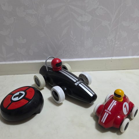 BRIO Radiostyrd bil i röd färg med fjärrkontroll. Leksaken är utformad för barn och är tillverkad av plast och metall. Den har en enkel design med en förarfigur och fyra hjul.