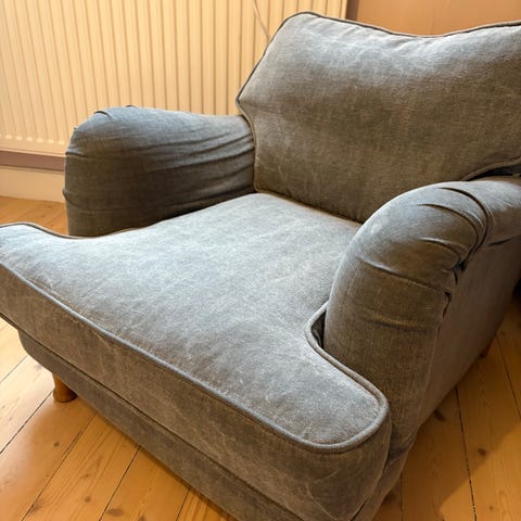 Fåtölj Howard från Englessons i svart linnetyg med extra armstödsskydd. Använd, men bra skick.