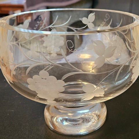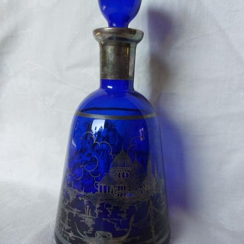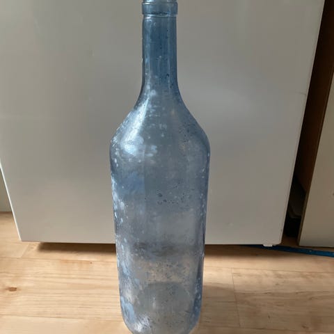 Glasflaska med dekorativt mönster av gröna blad. Transparent glas med färgglada bladdetaljer. Passar för förvaring av drycker och som dekorativ detalj i hemmet.