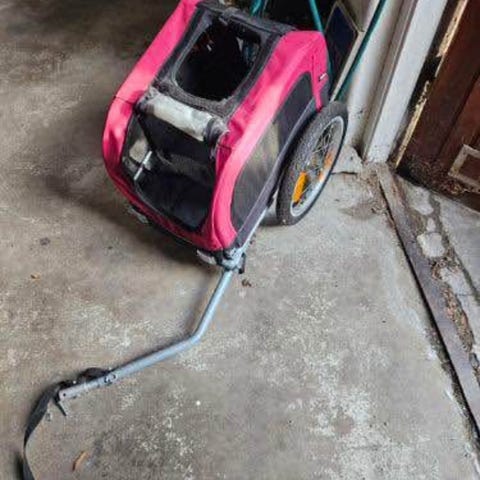 Tvåsitsig cykelvagn för Hund i lila färg med hemmagjord gallerskydd. Utrustad med stora hjul och dragstång för enkel anslutning till cykel. Passar för transport av Hund, matpåsar eller barn.