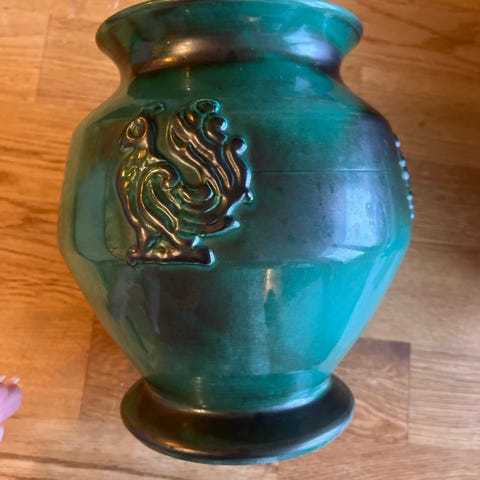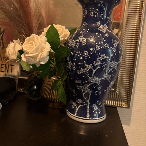 2 st likadana Blåa keramikgolvaser ( 46 cm höga) med motiv av fåglar och näckrosor. Vasen har en rund form med en något smalare hals och vit kant upptill. Den är lämplig för dekoration och kan användas för att hålla blommor. Säljes för 500-/st .