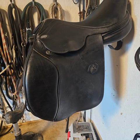 Fin svart hoppsadel 17’ som har setts över av sadelmakare i september 2024. Har använts på en D Ponny, 144 cm. Avtagbara knä och vadklossar.