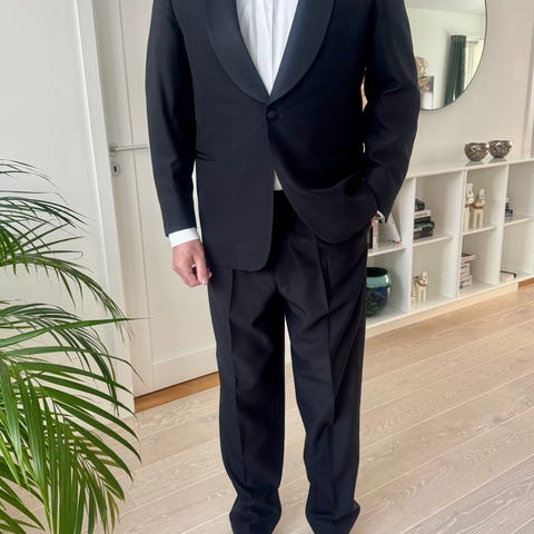 Elegant och stilfull smokingjacka i original från 1958. Etikettmärkt Essge. Från dödsbo, mycket välhållen, verkar knappt använd. Fantastisk kvalitet och gedigen tyngd. Ej storleksmärkt, men troligen stl 52/54, P g a dålig kamera ser den grå/blå ut på vissa foton, men den är helt svart. Finns på Hisingen i Göteborg. Kan skickas mot fraktkostnad.