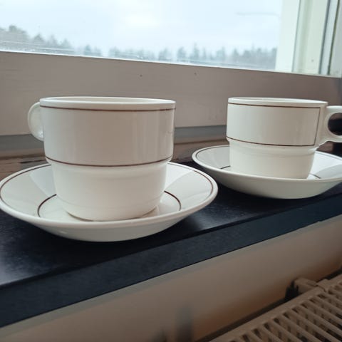 Klassisk vit design med brun linje runt kanten. Alla i mycket fint skick.