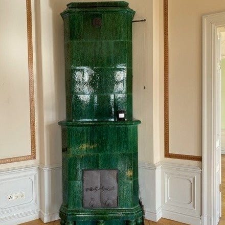 Mycket fin blåvit kakelugn tillverkad för hand ca 1790. Denna kakelugn är helt i original förutom fotställningen som är nytillverkad efter gammal förlaga.