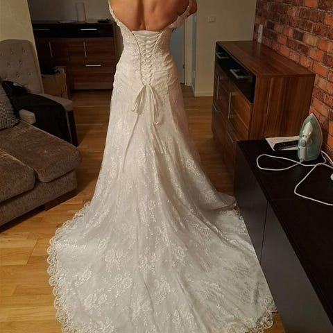 Fantastisk Bianco Evento klänning. Kemtvättad. Storlek 42/XL (justerad till uppskattningsvis mer M/L). Insytt nudetyg ovan midja samt extra spets över axlar (sytt hos sömmerska). Jag är 171 cm lång och bar lågskor. Finns i Tumba söder om Stockholm. Kan skickas mot portokostnad.