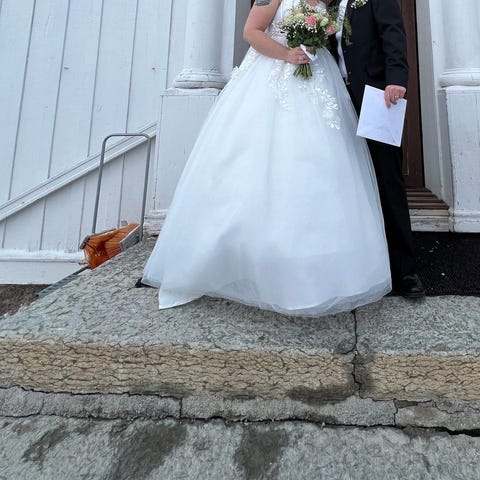 Fantastisk Bianco Evento klänning. Kemtvättad, inga fläckar. Storlek 42/XL (justerad till uppskattningsvis mer M/L). Insytt nudetyg ovan midja samt extra spets över axlar (allt är korrigerat och sytt hos sömmerska). Jag är 171 cm lång och bar lågskor. Finns i Tumba söder om Stockholm. Kan skickas mot portokostnad.