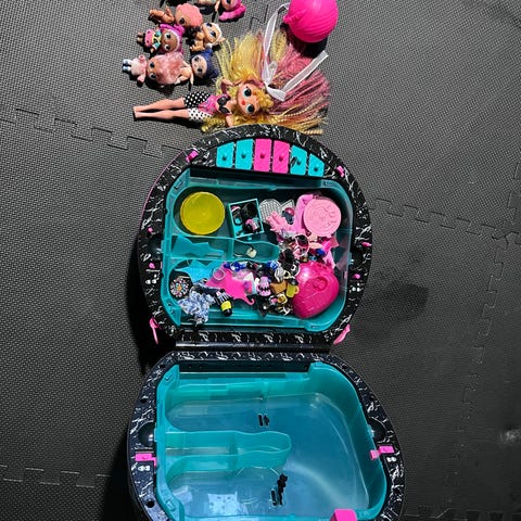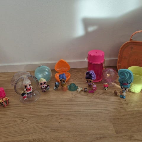 Lekset med flera tillbehör i olika färger inklusive rosa och blått. Setet innehåller olika små möbler och tillbehör som kan användas för lek och samling.