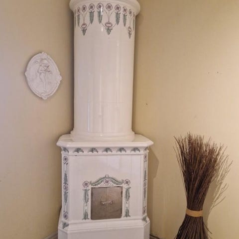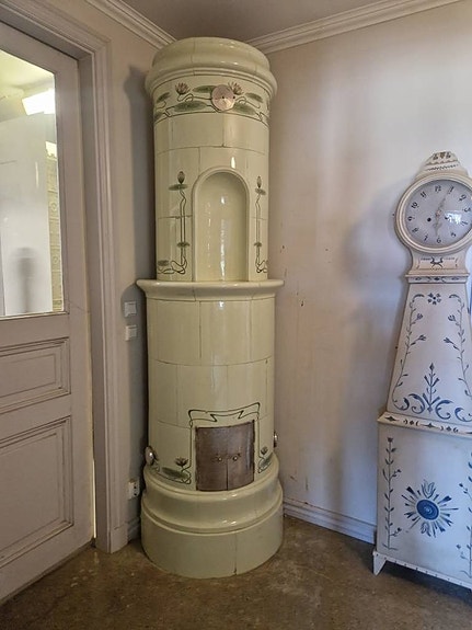 Mycket fin kakelugn tillverkad 1920-30. Denna kakelugn står uppställd i vår utställning. Denna kakelugn är ca 275 cm hög och för rak vägg.