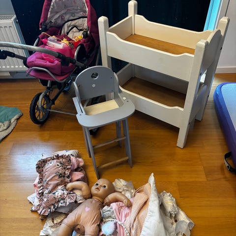 Säljer en mjuk docka och en baby born docka (pojke) samt diverse tillbehör så som car seat, bärsele, skötväska, skötunderlägg, mat, potta ,skor, jackor, byxor,mjukisdjur mm