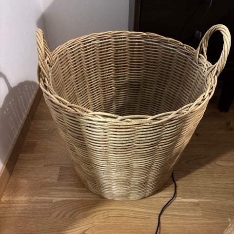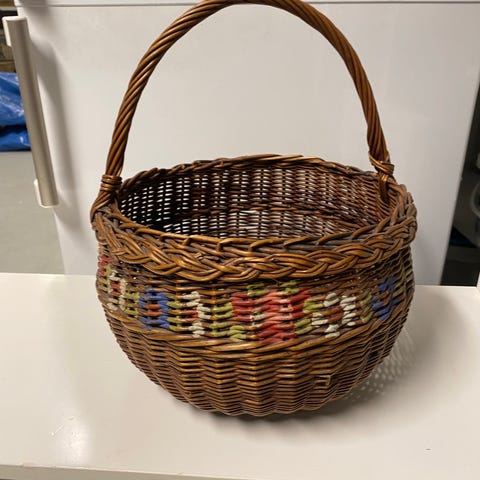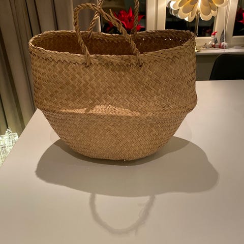 Flätad korg tillverkad i naturmaterial med två handtag. Korgen har en rund form och är lämplig för förvaring av diverse föremål i hemmet.