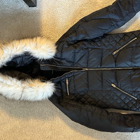 Rockandblue Dunjacka i storlek 36 för dam. Jackan är svart och tillverkad av dunmaterial. Den har dragkedjor och knappar samt en avtagbar huva med fuskpäls.