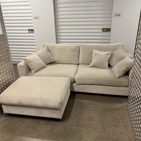 Rök och djurfritt hem. Soffan är i två delar, sittpallen är 150x100cm. Vid snabb affär ingår även gråa fotpallen från Sweef. Klädseln är avtagbar på alla rygg och sittkuddar även på fotpallen.