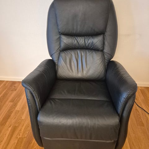 Svart El-Fåtölj i Skinn, steglös fällbar fot-och ryggstöd, till liggläge, roterande med kromad rund metallfot. Använd, allt fungera, i bra skick, lagad på nackstöd Nypris Mio för några år sen 9000:-