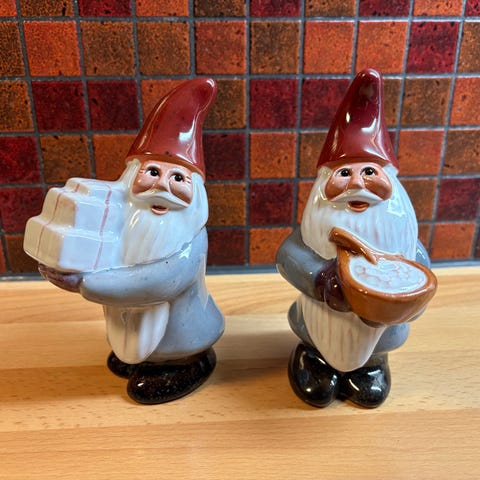 Ett par dockor föreställande en tomte och en tomtemor. Tomten har röd toppluva, röd tröja med svart bälte, svarta byxor och röda stövlar. Tomtemor har röd toppluva med rött hår, röd klänning med vitt förkläde och svarta skor.På skorna fins stämpel Norge