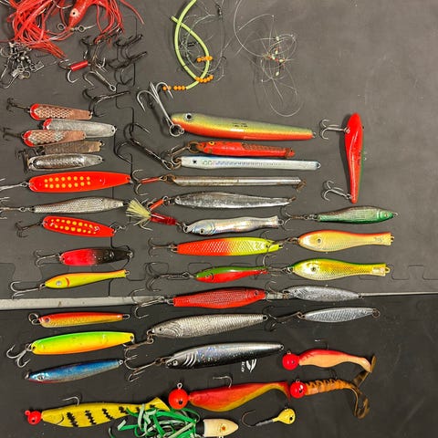 4 äldre fiskedrag. 2 st gula och orangea som är använda och 2 st aldrig använd, fortfarande i original förpackningar.