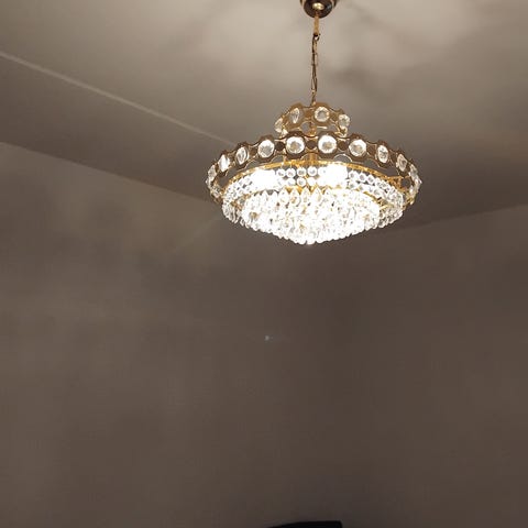 Tack lampa med fem armar i metall och vita glaskupor. Lampan har en klassisk design och är avsedd för takmontering med långa kedja , alla lamporna med följer , enligt på bilder finns i Västerås .
