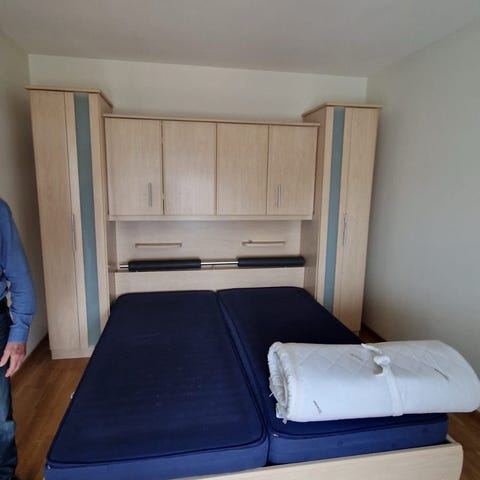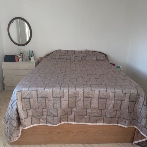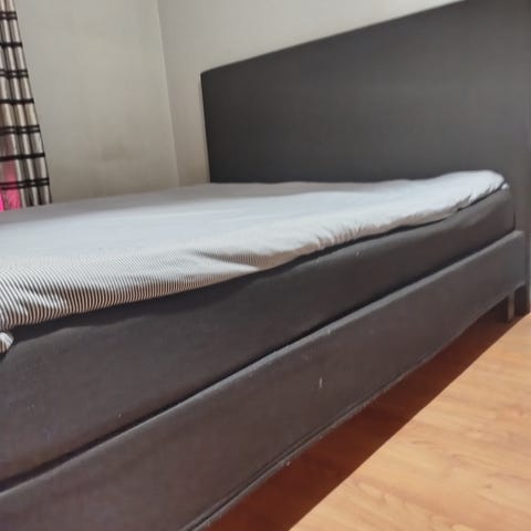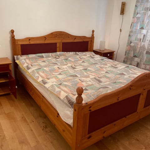 Sängram i trä med plats för madrass i standardstorlek. Passar för sovrum och erbjuder en stabil grund för sovkomfort.