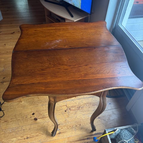 Antikt spelbord tillverkat i trä. Bordet har snidade ben och en varm träfinish. Passar som matbord eller skrivbord i mindre utrymmen där flexibilitet i storlek önskas.
