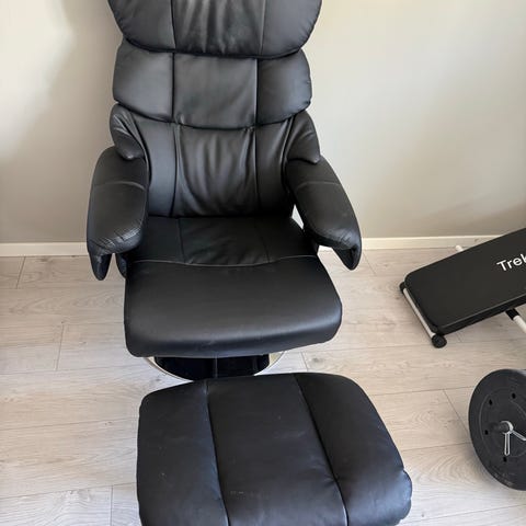 Roterbar Massagefåtölj med fotpall. Svart Konstläder. OBS! uppackad, monterad men OANVÄND.