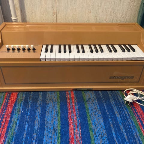 Kawai E120 elektroniskt orgel från 70 talet. Utrustad med tangentbord, pedalbord, kassett ingång och hörlursutgång.