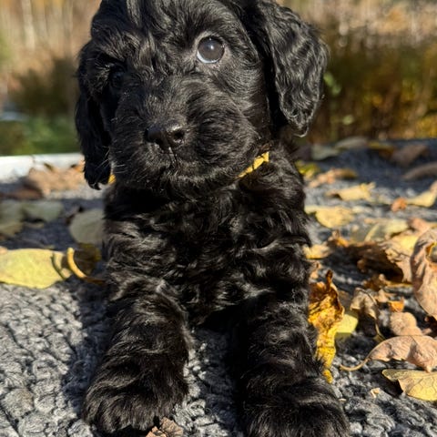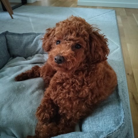 Pälsen är lite lätt vågig nu som valp men när den släpper valppälsen vid ca 6-7 månaders ålder brukar lockarna efter pudeln bli mer framträdande.