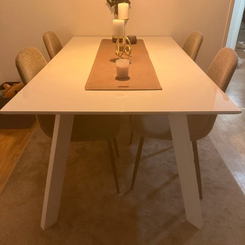 Matbord i vit färg kan man både för fyra eller sex personer. Bredd är 120/160 cm. Det är som ny, inga smuts eller missfärgade. Jag säljer för 1000 kr för en snabb affär.