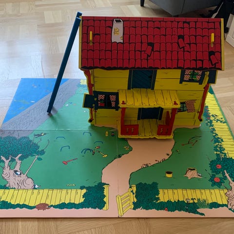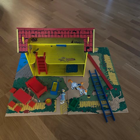 Pippi Långstrump dockhus med flera figurer. Dockhuset är utformat som Villa Villekulla med detaljer som fönster och dörrar. Figuren inkluderar karaktärer från Pippi Långstrump-serien,.