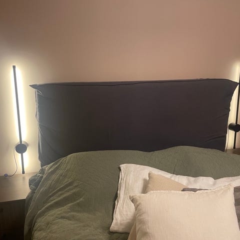 Vi har bytt sänggavel och säljer den gamla. Fint skick. Det enda som finns att anmärka på är ett hål i fodertyget på baksidan (se bild) Alltså inget som syns🙂.