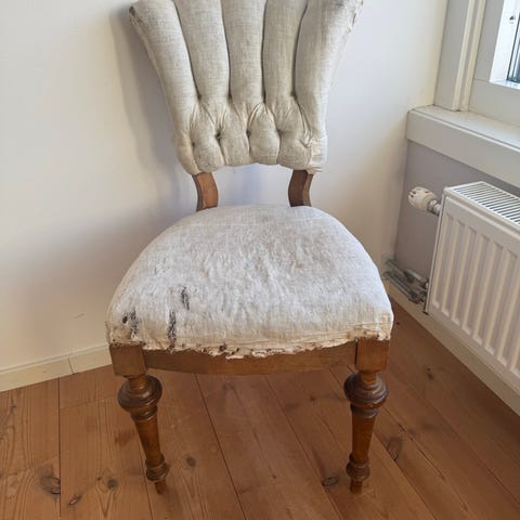 Äldre stolar, troligen omålade, sits i brunt läder, troligen imitation.