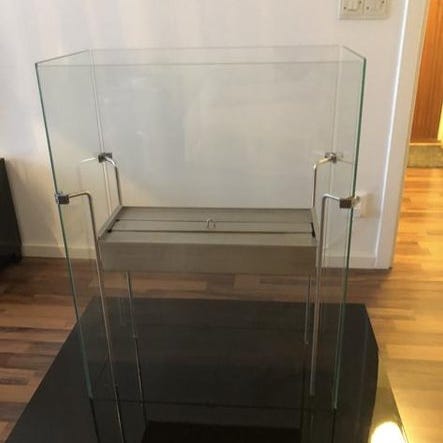 Mindre braskamin av märket Scan. Härlig, liten men högeffektiv kamin. Ca 15 år gammal. Höjd med täljstensben och överliggande täljstensskiva 81 cm. Bredd med täljstensskivor 51. Djupet med värmeskyddande plåt och liten hylla för glödskydd 47 cm. Skorstensrör upp till vinkel 114 cm. Från vinkel till vägg 51,5 cm.