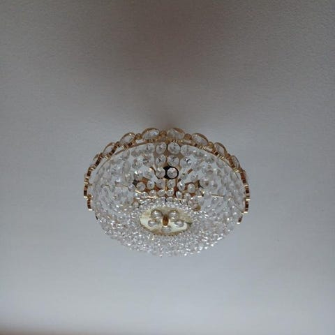 Kristallkrona mässing med glasprismor från ca 50-tal från Hantverket AB Sweden. Höjd ca 60 cm, diameter ca 35 cm, med 5 lampor, höjden justerbar. Vacker nätt krona med fina detaljer.