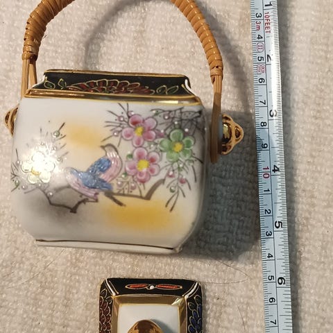 Porcelain basket with a lid, featuring a woven design and floral decorations on top. The basket is cream-colored with gold detailing along the edges. It stands on a round pedestal base and is suitable for decorative use or as a container for small items.