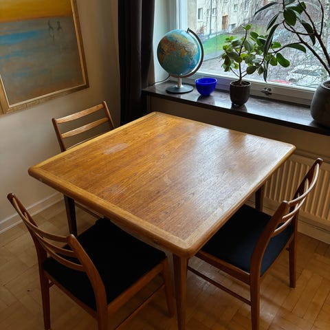 4 stolar i teak med rosa tyg och vadderade sits och rygg. Design av Erik Buch. Modell nr 50 tillverkad för OD möbler 1957.