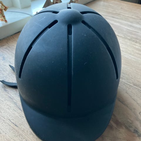 Hansbo Sport ridhjälm i storlek 57. Hjälmen är svart med en textur som liknar krokodilmönster och har två vita ränder på ovansidan. Insidan är vadderad för komfort och säkerhet. Hjälmen är CE-märkt och levereras med instruktioner.