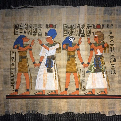 Handmålad tavla med motiv från Egypten, inklusive pyramider och palmer. Tavlan är målad på ett tjockt, texturerat material som visar tecken på slitage och ålder längs kanterna.