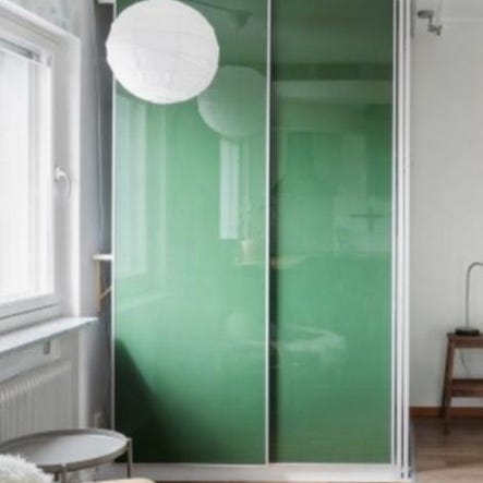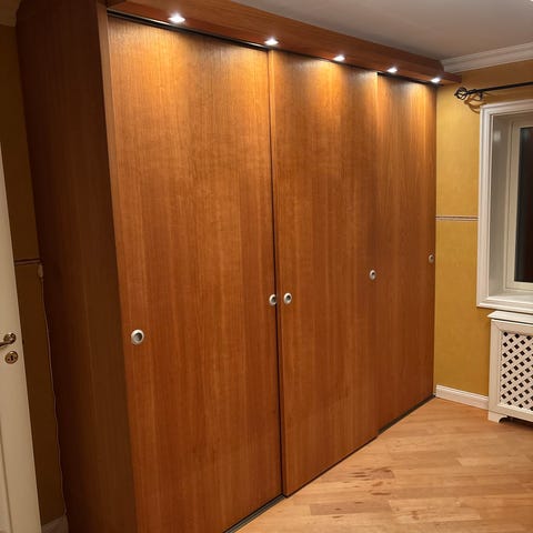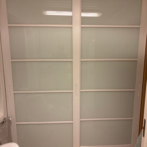 Skjutdörrar med skenor. Varje dörr är 150x236 så totalt 300x236.