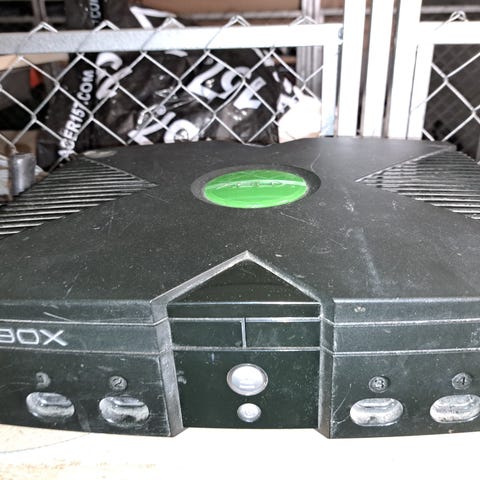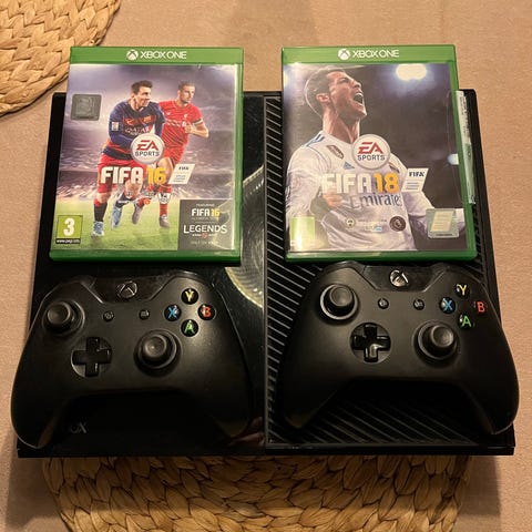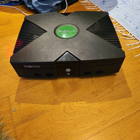 Xbox original i bra skick, det medföljer två handkontroller och ett bilspel.