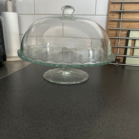 Glas tårtfat med fot, diameter 29 cm, tillverkad i transparent glas. Fatet har ett mönstrat yttre och en stabil fot för att hålla tårtor eller bakverk. Passar för servering och presentation av bakverk.