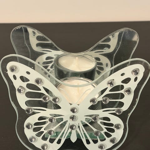 2 ljushållare i glas med guldfärgad kant. Passar för värmeljus och används som dekorativa föremål.