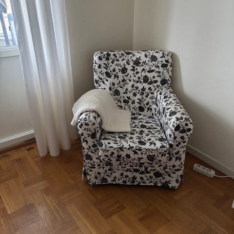 Bekväm och snygg fåtölj i sammetstyg, perfekt till vardagsrum eller sovrum. Stabil och stadig med träsben i ljust trä.