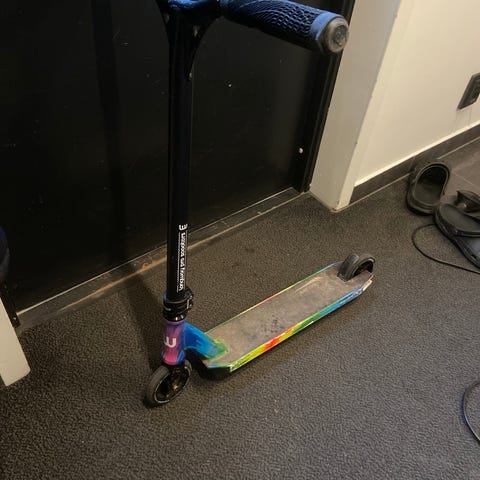 Säljer en kickbike som är sparsamt använd o i gott skick. Säljer också en bandyklubba, ett par pussel( alla bitar.finns)spelet råttfällan samt 4 böcker ur serien om Lassemajas detektivbyrå. Böckerna är som nya. Vill ha 400 kr för allt.