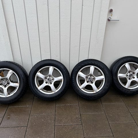 Saab 9-3 (generation 1) plåtfälgar med Michelin dubbdäck 195/65-15. Ett däck är nyare och har mönsterdjup på 7 mm och tre st mönsterdjup 4-5 mm. Dock är ett mer slitet på innerkant, se bild, det översta i däckstraven.