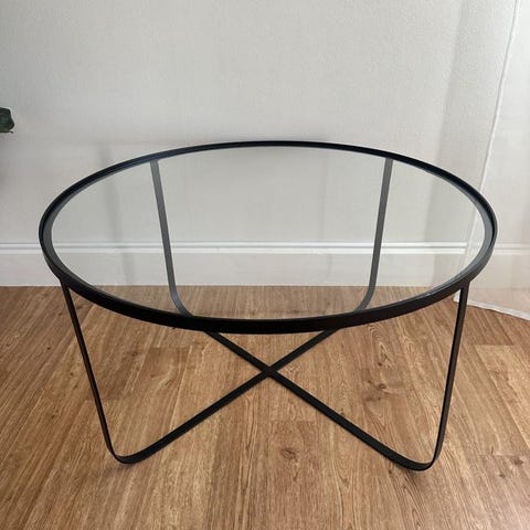Säljer våran soffbord (Ø 100 cm) med glasbordsskiva.