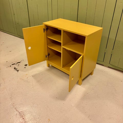 Det här jättefina skåpet är tillverkat av trä och har tre sektioner: två med luckor och en öppen hylla. Bakom den stora luckan på vänster sida finns två justerbara hyllplan, perfekta för att anpassa förvaringen efter barnens leksaker och spel.