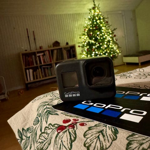 GoPro Hero 9 Black actionkamera med svart färg. Kameran är designad för att filma och fotografera i olika miljöer och aktiviteter. Den levereras med ett skyddsfodral och tillbehör som laddkabel och monteringsfäste.